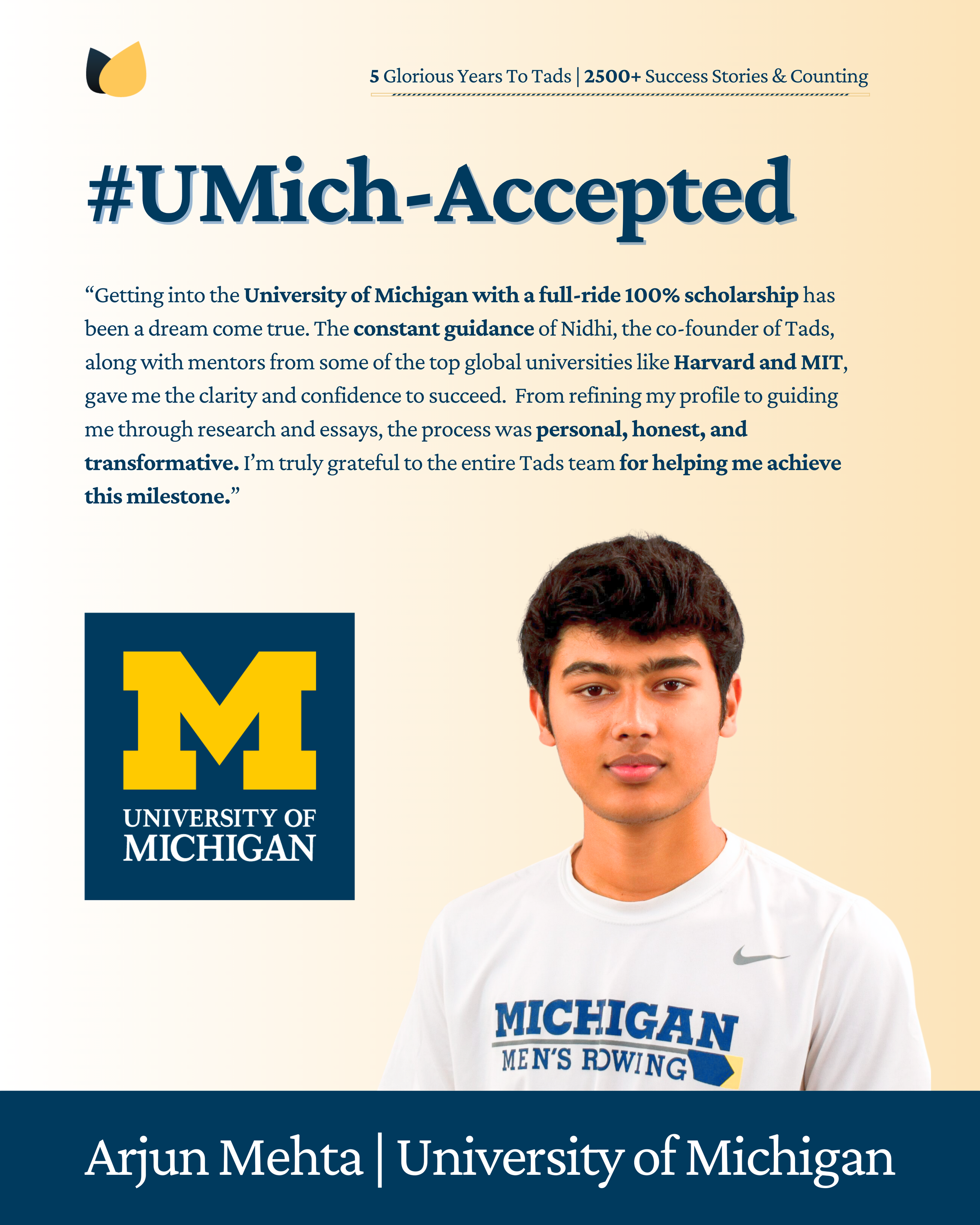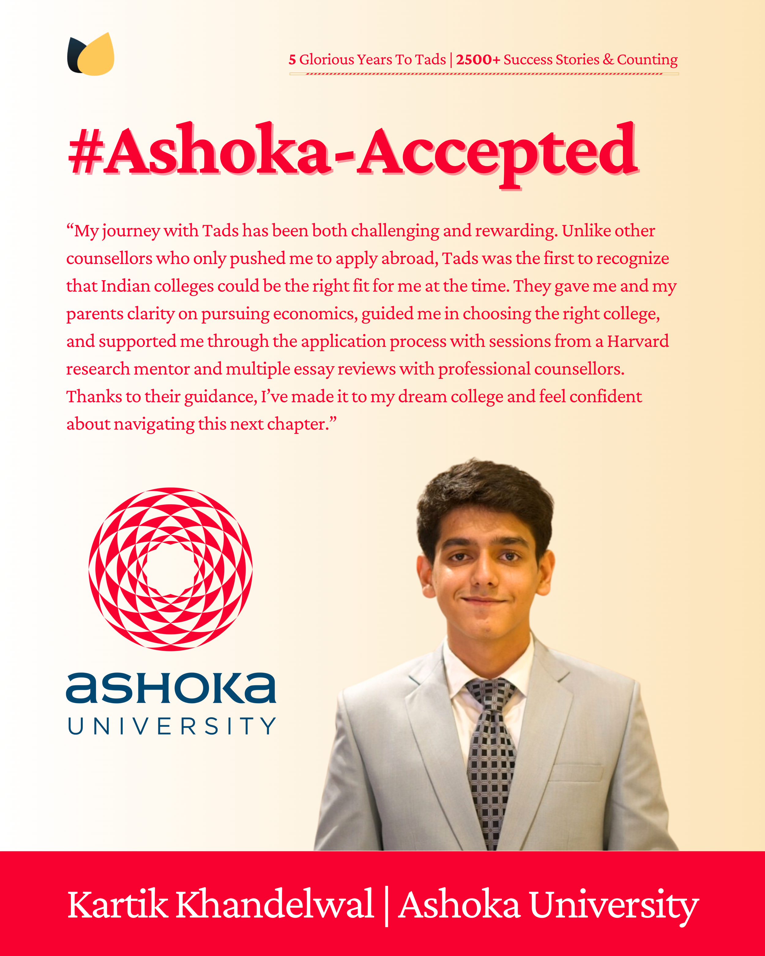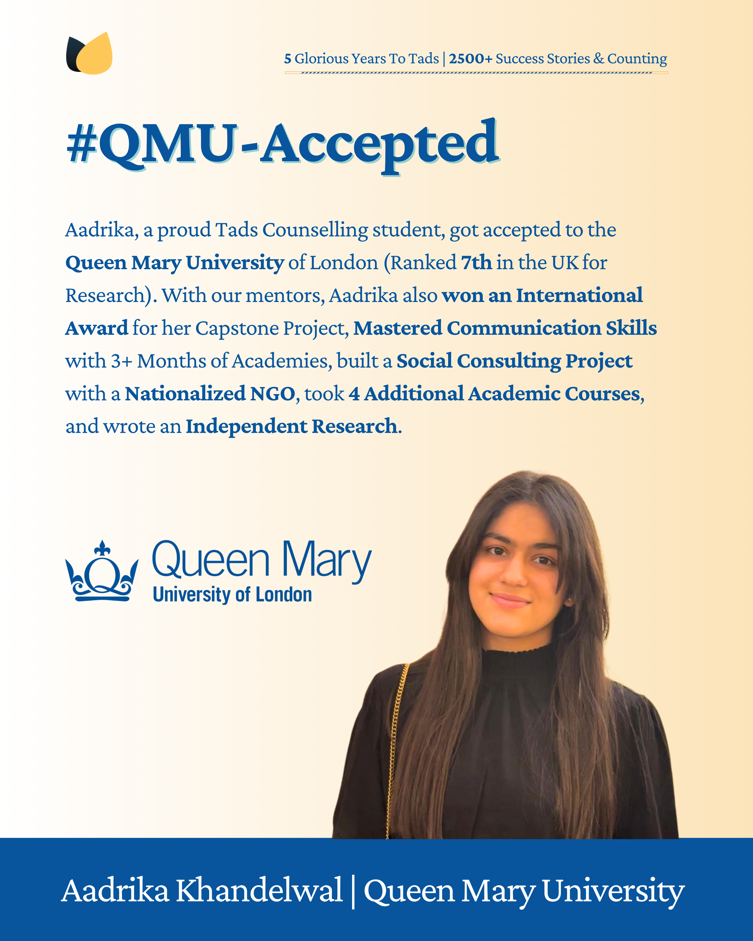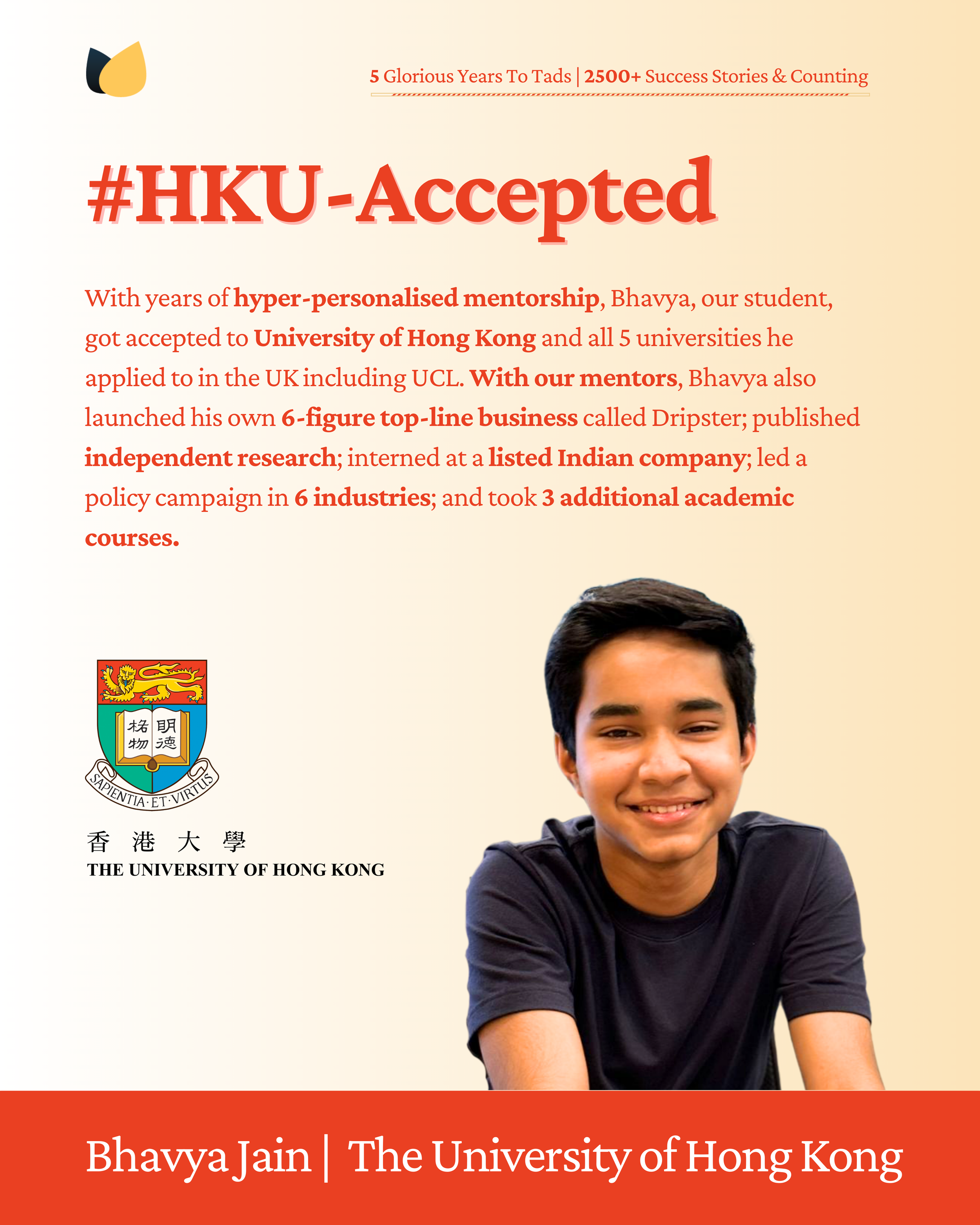 “My life’s turning point was joining Tads mentorship! Getting accepted to NUS & Imperial for their flagship finance postgrad programmes was simply a dream coming true. The previous year, when I applied by myself, I only received rejections. But after one year of intensive profile development with Hardik, Naman, and all other advisors at Tads, I ended up with offers from all my dream universities. Most importantly, I am a lot more confident to go to university as a more prepared candidate.”